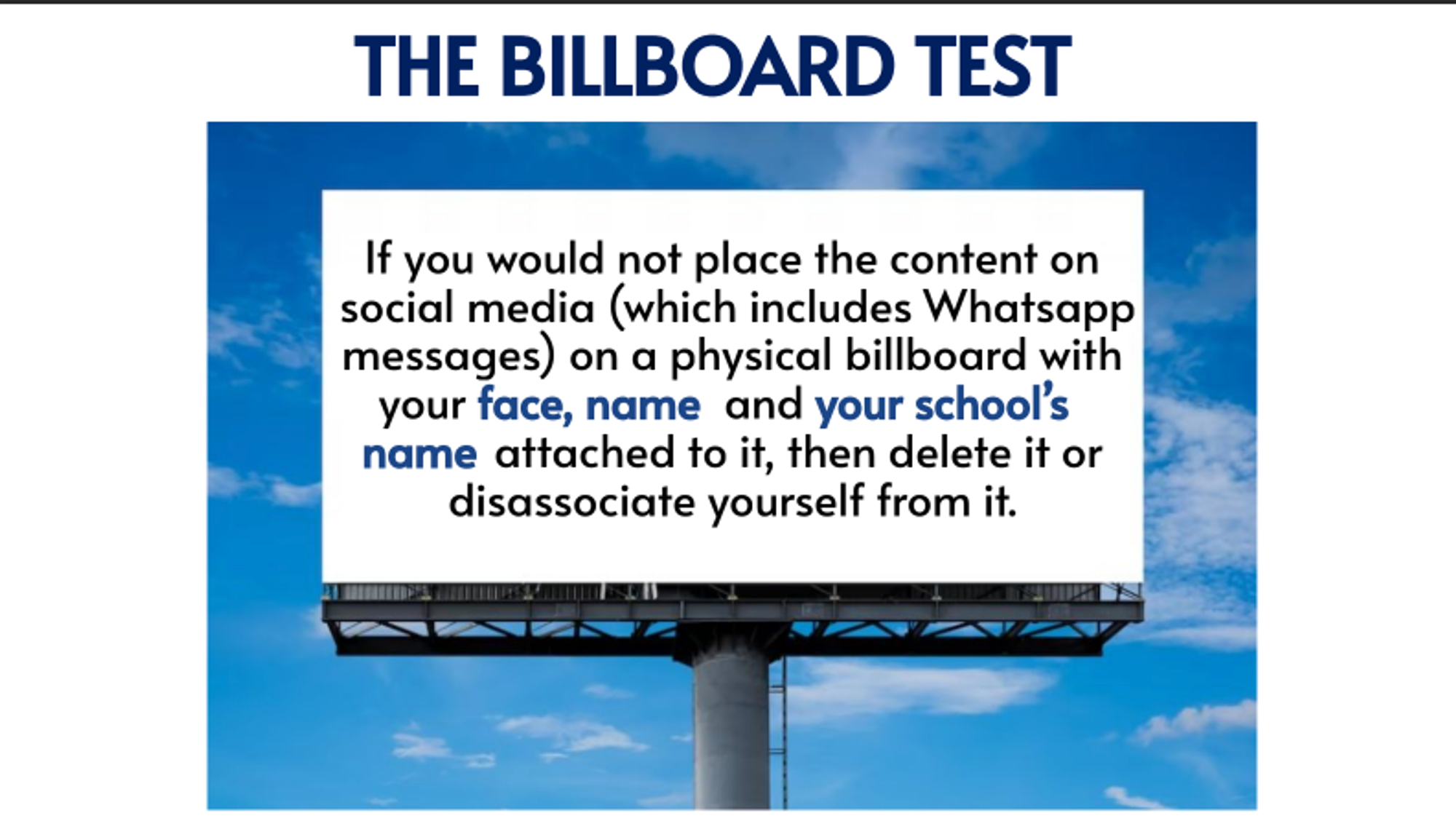 I was sitting in a school meeting recently, next to my teenage daughter, listening to a framework the school has been using to guide learners’ behaviour online. It’s called the “Billboard Test.” The idea is that if a young person wouldn’t be comfortable seeing a message, image, or post displayed on a public billboard with their name, face, and school attached to it, then they shouldn’t post it online at all.